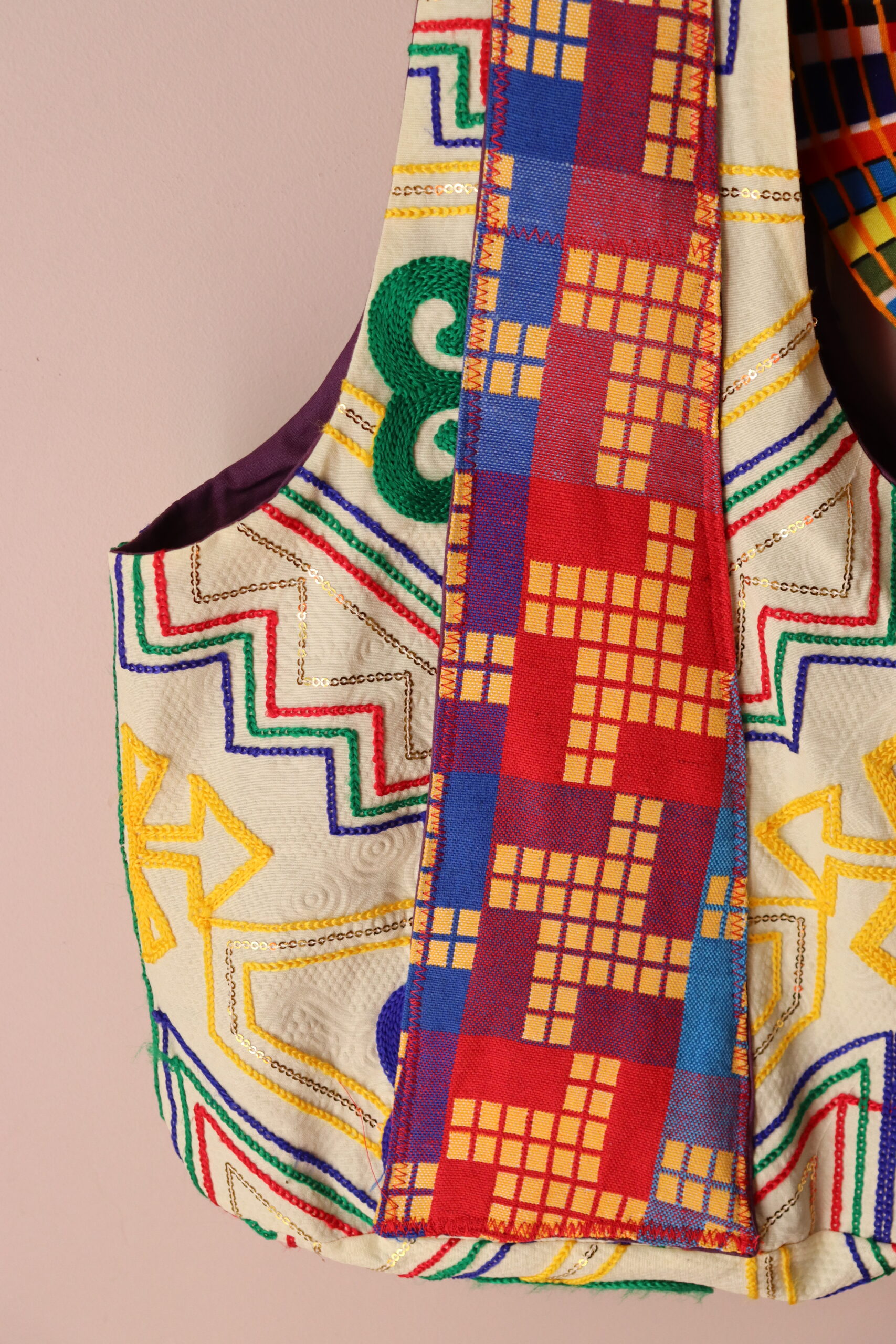 Statement accessory crafted from Nigerian fabrics , featuring adjustable straps for varied length adjustment. Blending functionality with high-fashion appeal.